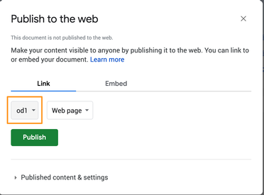 3. A window should appear, change the menu that reads "entire document" to "od1." Then, click the blue "publish button. When asked, "Are you sure..?" click OK. Ignore the URL that appears in the center of the window. Just Close the window using the X in the top right corner.