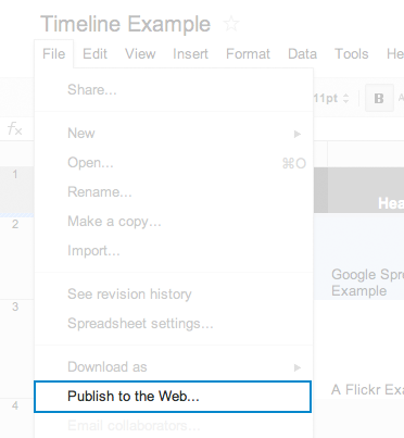2. In your Google Drive spreadsheet: Under the File menu, select "Publish to the Web."