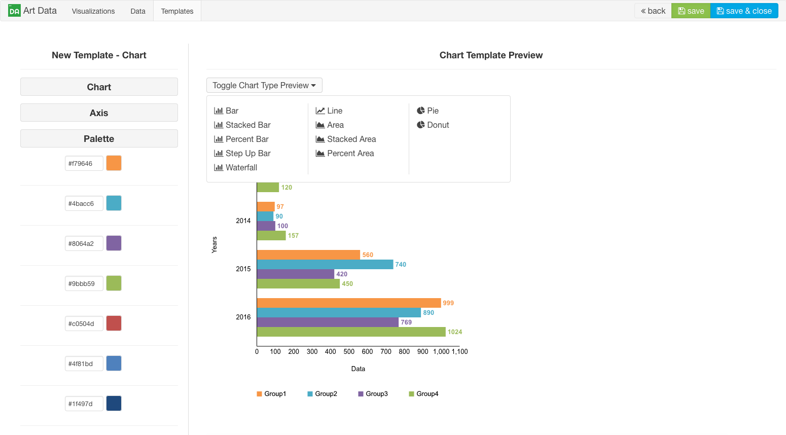 You can use the "Toggle Chart Type Preview" dropdown to select what type of chart you want to use to preview the look of your template.
